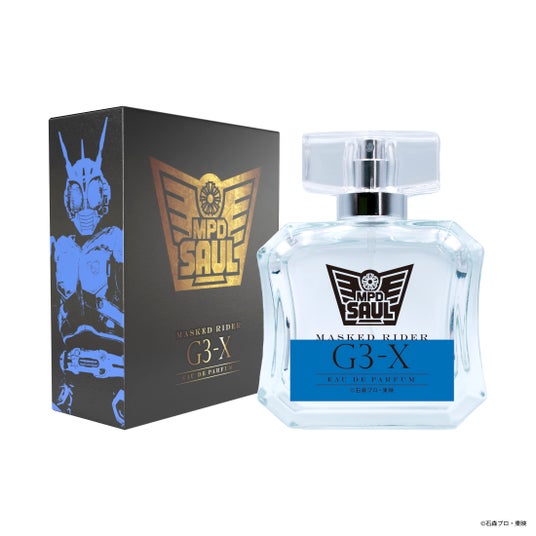 氷川誠が装着する、仮面ライダーG3の強化改良型となる仮面ライダーG3-Xの香水は、G3-Xの機動力を表現した鋭く爽快なマリンフゼアノートです。トップノートのクールなミントとマリンの鋭い爽快感が、一瞬で戦況を見極めながら戦うG3-Xの姿が思い浮かびます。ミドルノートのフローラルノートの調和は、AIの制御に成功し、氷川誠が使いこなせるようになったG3-Xの能力を表現しています。ムスキーノートが香りを安定させるラストノートは、覚醒した力ではなく、人間と組織が作り上げた積み上げてきた強さを感じます。