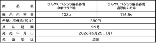 株式会社 永谷園(社長:掛谷 浩志、東京都港区)は、年々延びる夏の期間に対応した新商品「ひんやりつるもち麻婆春雨 中華サラダ味」「同 濃厚肉みそ味」(希望小売価格・税抜380円)を2026年5月25日(月)より全国で発売いたします。従来の温かい麻婆春雨(1981年発売)とは異なり、冷やして食べる副菜として開発しました。つるもち食感の平めん春雨を使用し、サラダ感覚で毎日の食卓に気軽に加えられる一品です