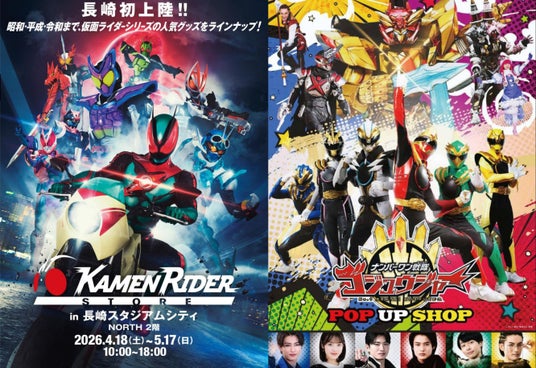 長崎初上陸となる「仮面ライダーストア」では、最新作の仮面ライダーゼッツや、25周年を迎える仮面ライダーアギトなど、令和・平成・昭和の仮面ライダーシリーズの人気商品が勢揃い。さらに、大人気「ナンバーワン戦隊ゴジュウジャー POP UP SHOP」の商品も一部取り扱い予定。皆様のお越しをお待ちしております。