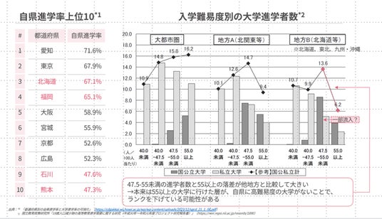 出典:*1 「都道府県別の自県進学率と大学進学率の可視化」(https://cdgakkai.ws.hosei.ac.jp/wp/wp-content/uploads/2023/12/sgcd_21_1_08.pdf) *2 国立教育政策研究所「18歳人口減少期の高等教育進学需要に関する研究(平成30年~令和元年度プロジェクト研究報告書)」(https://nier.repo.nii.ac.jp/records/1890)
