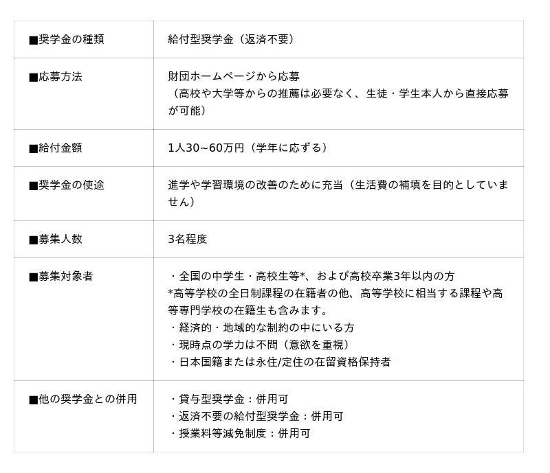 初年度3名程度に最大60万円の奨学金と教育支援を提供します。