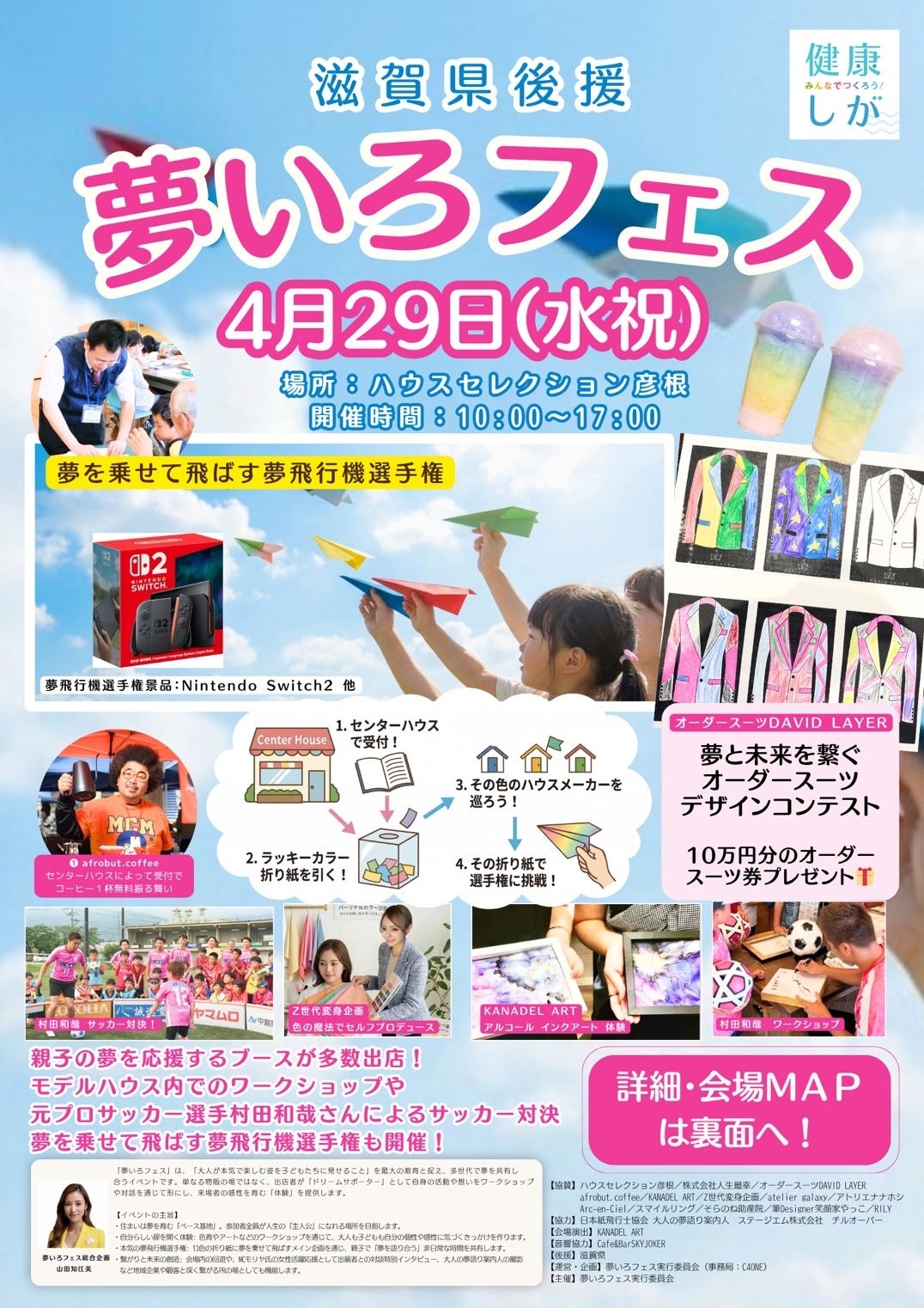夢いろフェス実行委員会(総合企画:山田知江美)は、2026年4月29日(水・祝)10時~17時、滋賀県彦根市のハウスセレクション彦根にて「夢いろフェス」を初開催します。「大人が本気で楽しむ姿を子どもに見せることが最大の教育」という理念のもと、ママをはじめとする女性が自らの夢や活動を発信し、子どもや地域と共に感性を育む、女性活躍支援×キャリア教育の体験型イベントです。大人の夢語り案内人・西利範も共鳴・参加し、出展者・来場者の夢語り動画を現地撮影。「3,695人の夢語りプロジェクト」の一環として、彦根から全国へ夢の輪をつなげます。入場無料(一部ワークショップは有料・要事前予約)。2026年4月29日(水・祝)、滋賀県彦根市で、ママの夢実現と女性活躍支援をテーマにした全く新しいフェスが幕を開けます。その名は「夢いろフェス」。住宅展示場がまるごと多世代の夢の舞台に変わる、彦根初開催の一日限りの体験型イベントです。