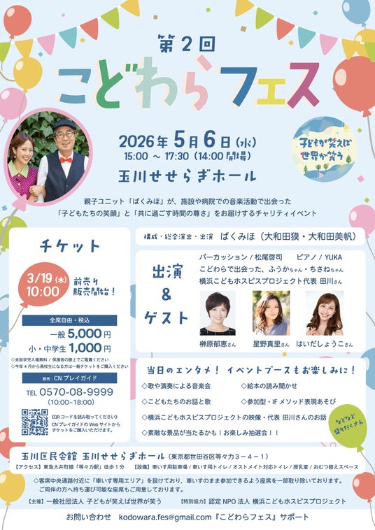 一般社団法人 子どもが笑えば世界が笑う(代表:大和田美帆)は、2026年5月6日(水・振替休日)、玉川区民会館せせらぎホールにて、チャリティーイベント「こどわらフェス」を開催いたします。本イベントは、病気や障がいとともに生きる子どもたちやご家族の存在を広く社会に伝え、エンターテインメントを通して、誰もが楽しみながら学び、つながる場を目指す社会的活動です。チケット売上の利益は全て、小児がんの子どもたちなどが家族と過ごす施設・横浜こどもホスピスへ寄付されます。