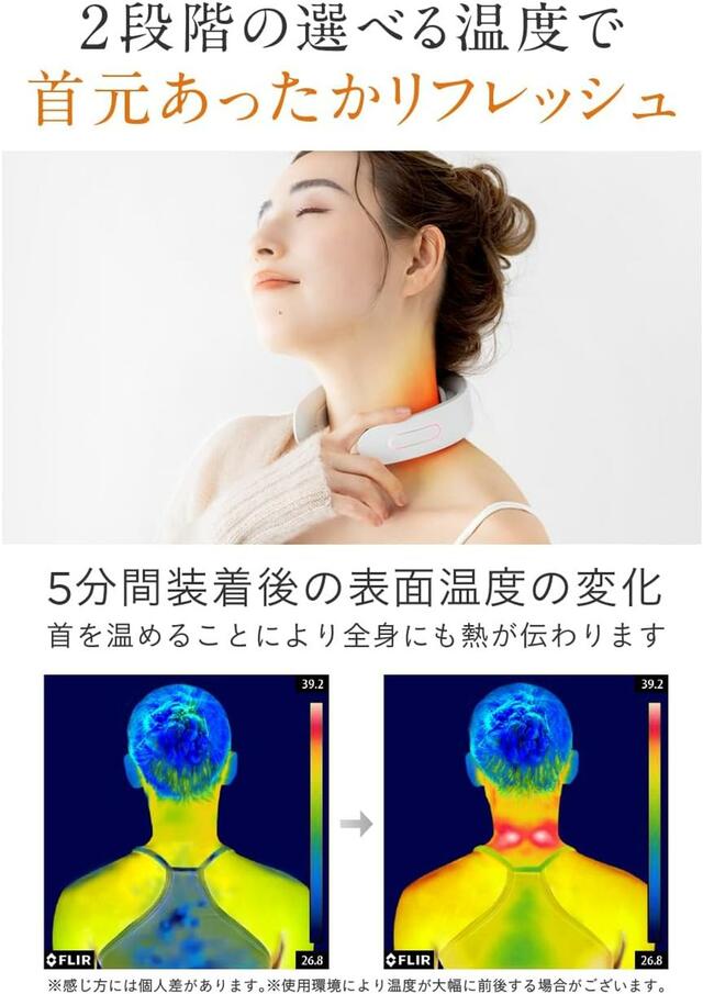 装着後すぐに首を温め、全身にも熱が伝わるのが特長。蒸しタオルを当てているような心地よさでスッキリします。就寝前のリラックス時間に使えば、睡眠の質がアップすること間違いなしです。