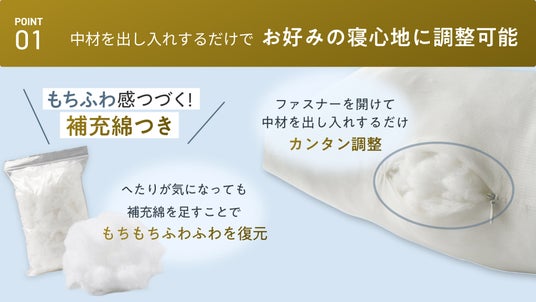 【"もちふわ"マイクロファイバー綿がしっかり支え、中材でお好みの寝心地に調整可能。】一般的な繊維よりはるかに細い繊維が空気をたっぷり含み、肌に吸い付くようなやわらかさを実現。細い繊維が絡み合うことでほどよく沈み込み、寝姿勢にしっかりフィットします。復元力が高くへたりにくいため、毎晩ふっくらとした寝心地がつづきます。ファスナーで中材を出し入れするだけで高さも簡単に調整でき、低めなら首元をやさしくサポート、高めなら横寝や包まれる寝心地に。へたりが気になっても、付属の補充綿を足せばもちもちふわふわの感触を復元できます。