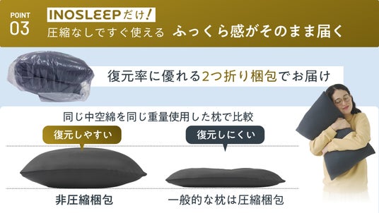 同じ素材・同じ重量で比較した際、圧縮梱包の枕より非圧縮梱包のほうがより復元しやすいことが確認されています(※)。INOSLEEPもちふわ枕は復元率に優れた2つ折り梱包でお届けするため、開封してすぐにふっくらした状態でご使用いただけます。
