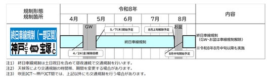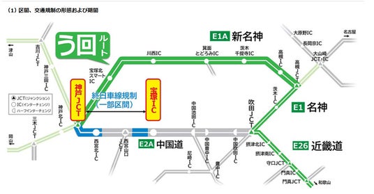 宝塚(たからづか)インターチェンジ(IC)~神戸JCT間では一部の区間で終日車線規制を行います。朝夕を中心に渋滞が予測されておりますので、E1A新名神高速道路(E1A新名神)等へう回いただきますようお願いいたします。