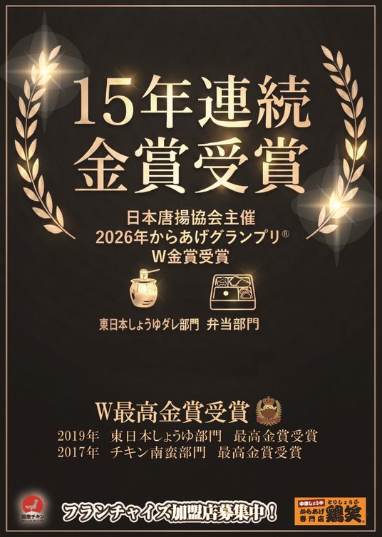 SRSグループの株式会社NIS(本社:大阪府大阪市、代表取締役執行役員社長 岡田連平)が運営する「からあげ専門店 鶏笑」は、一般社団法人日本唐揚協会が主催する「第17回からあげグランプリ」において、「東日本しょうゆダレ部門」および「弁当部門」にてW金賞を受賞いたしました。また、2017年の「チキン南蛮部門」最高金賞、2019年の「東日本しょうゆダレ部門」最高金賞の受賞を含め、鶏笑は15年連続で金賞を受賞しております。