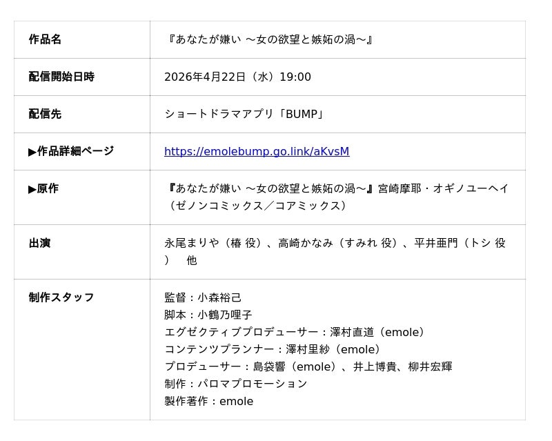 ショートドラマアプリ「BUMP」を運営するemole株式会社(本社:東京都目黒区、代表取締役:澤村直道、以下emole)は、『あなたが嫌い ~女の欲望と嫉妬の渦~』(原作・宮崎摩耶/漫画・オギノユーヘイ/コアミックス刊)を実写化したBUMPオリジナルショートドラマ『あなたが嫌い ~女の欲望と嫉妬の渦~』を2026年4月22日(水)19:00よりBUMP独占配信いたします。