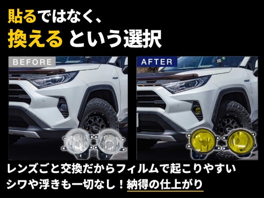 また、SUVやオフロード車オーナーの間で、レンズカラーをイエローにカスタムしたいニーズがありましたが、従来のレンズにフィルムを貼る手法では「シワや浮き」が発生しやすく、経年劣化で愛車の美観を損なうという悩みがありました。