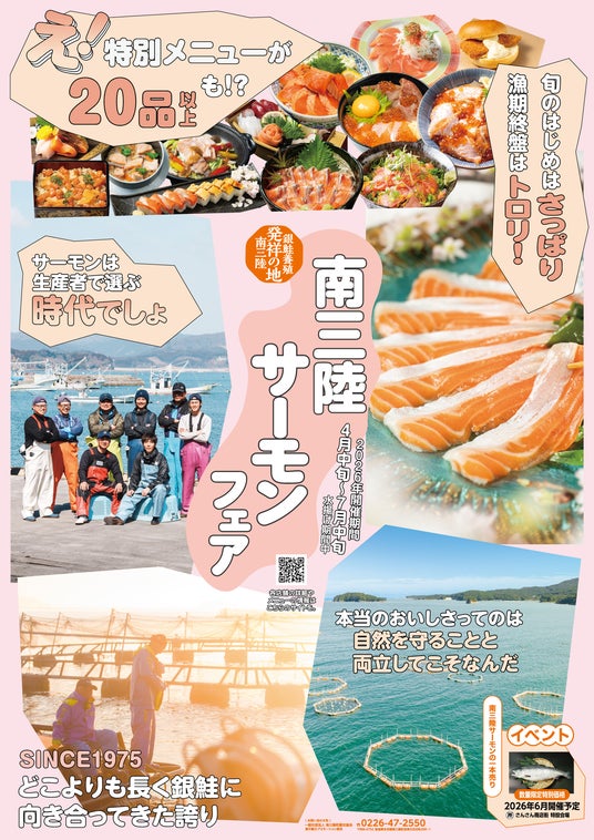 一般社団法人南三陸町観光協会・食の魅力プロモーション部会(部会長:吉田圭吾)は、町内で水揚げされるブランド銀鮭「南三陸サーモン」を楽しむグルメ企画「南三陸サーモンフェア2026」を、4月24日より開催いたします。