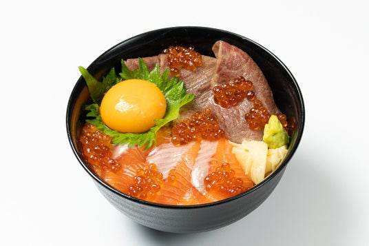 南三陸サーモンと仙台牛サーロイン炙り食べ比べ丼脂ののったサーモンと極上肉をひとつの丼に合わせました。