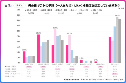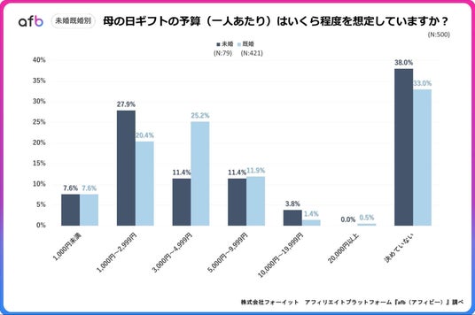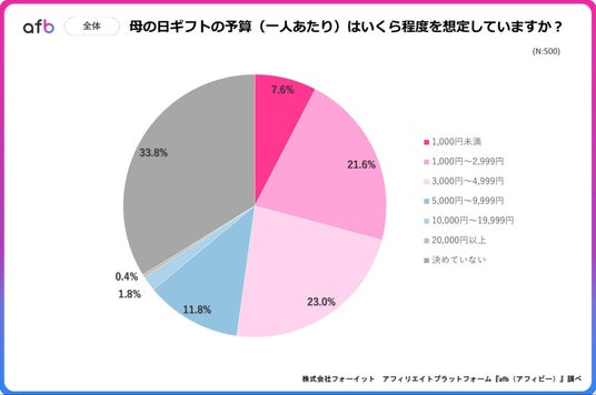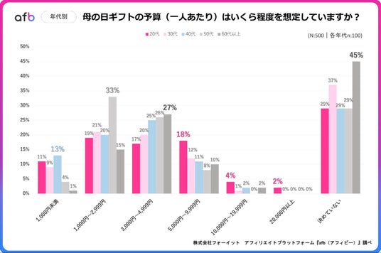 アフィリエイトプラットフォーム「afb(アフィビー)」< https://www.afi-b.com/ >の開発運用をおこなう株式会社フォーイットは、全国の20代~60代までの500人を対象に母の日についてのアンケートを実施し、年代別等の特徴についてまとめました。