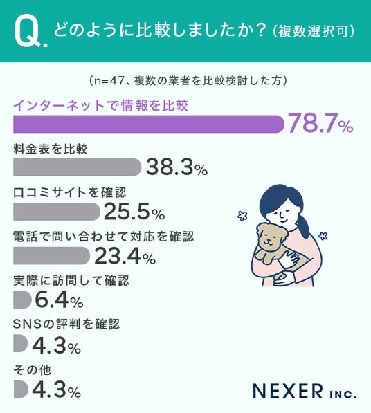 その結果「インターネットで情報を比較」が78.7%と最も多い結果になりました。次いで「料金表を比較」が38.3%、「口コミサイトを確認」が25.5%と続きます。