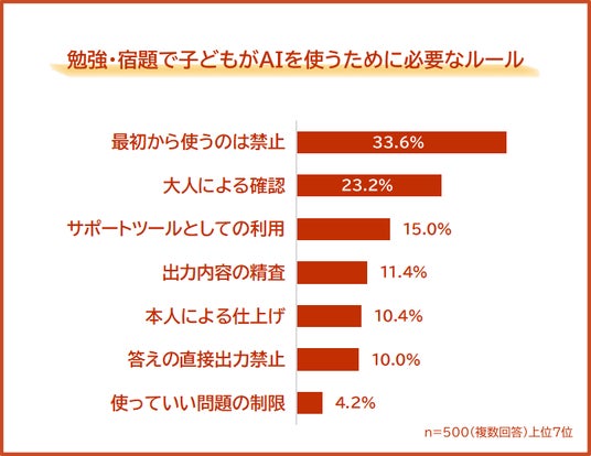 親が考える「勉強・宿題で子どもがAIを使うために必要なルール」の1位は「最初から使うのは禁止(33.6%)」。次ぐ2位は「大人による確認(23.2%)」、3位は「サポートツールとしての利用(15.0%)」でした。