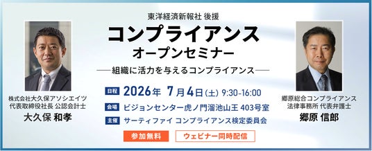 株式会社サーティファイ(本社:東京都中央区、代表取締役:瀧澤茂)コンプライアンス検定委員会は、郷原総合コンプライアンス法律事務所 代表弁護士 郷原信郎氏と、株式会社大久保アソシエイツ 代表取締役社長 大久保和孝氏を講師に招き、「2026年度夏期コンプライアンスオープンセミナー -組織に活力を与えるコンプライアンス-」を2026年7月4日(土)にビジョンセンター虎ノ門 溜池山王とオンライン配信のハイブリッドで開催します。