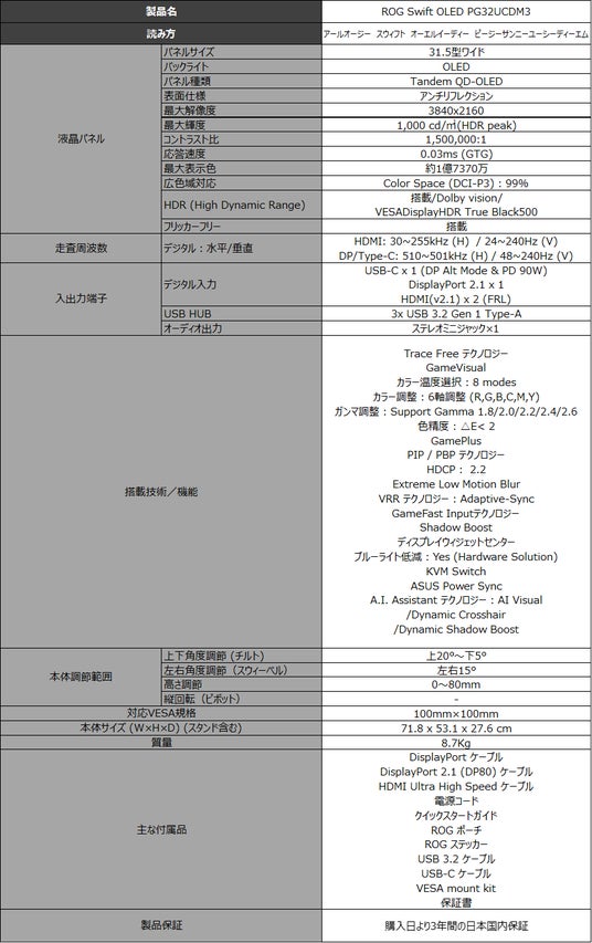 製品詳細:https://rog.asus.com/jp/monitors/27-to-31-5-inches/rog-swift-oled-pg32ucdm-gen3-pg32ucdm3/