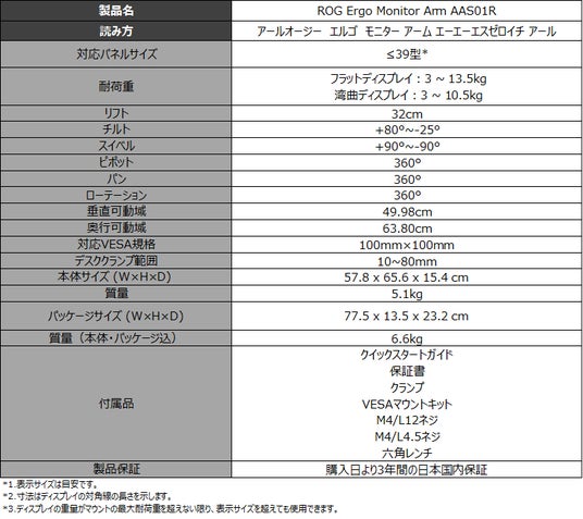 製品詳細:https://rog.asus.com/jp/monitors/accessories/rog-ergo-monitor-arm-aas01r/