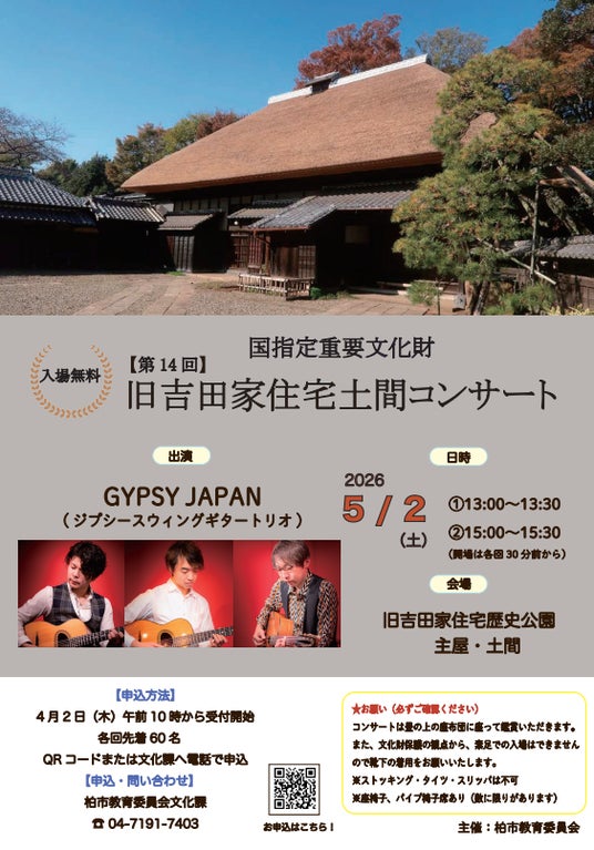 国指定重要文化財「旧吉田家住宅歴史公園」の土間を会場に、都内を中心に柏市でも活躍するギタートリオの「GYPSY JAPAN(ジプシージャパン)」によるコンサートを開催します。