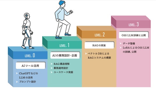 本校で学べるAI講座の学習ステップ(イメージ)※LEVEL.4(社会に貢献する基盤モデルの研究・公開)、LEVEL.5(AGI開発・世界規模での展開・社会統治に対応可能)についても、ご本人の修得状況に応じて学んでいけるようカリキュラムをご用意しています。