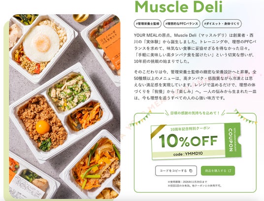 「BUILD MEAL!」──4ブランドの沿革と最新情報、10%オフクーポンを発行「BUILD MEAL!」では、YOUR MEALが展開する4つのブランド──Muscle Deli(マッスルデリ)、YOUR MEAL(ユアミール)、YOUR BREAD(ユアブレッド)、YOUR COFFEE(ユアコーヒー)の沿革と最新情報を紹介します。