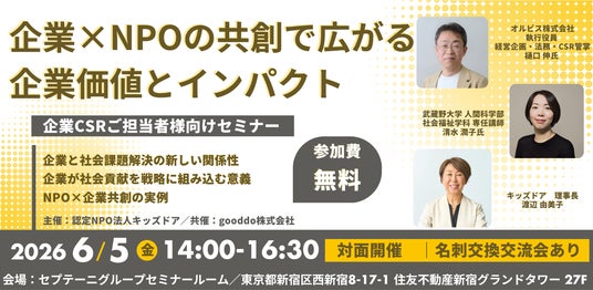 株式会社セプテーニ・ホールディングス(本社:東京都新宿区、代表取締役:神埜 雄一、証券コード:4293)の連結子会社である gooddo株式会社(本社:東京都新宿区、代表取締役社長:下垣 圭介、以下「gooddo」)は、認定NPO法人キッズドア(所在地:東京都中央区、理事長:渡辺 由美子、以下「キッズドア」)と共同で、企業のCSR・サステナビリティご担当者様を対象 にした無料セミナー「企業×NPOの共創で広がる企業価値と社会インパクト」 を 6月5日(金)に開催 いたします。