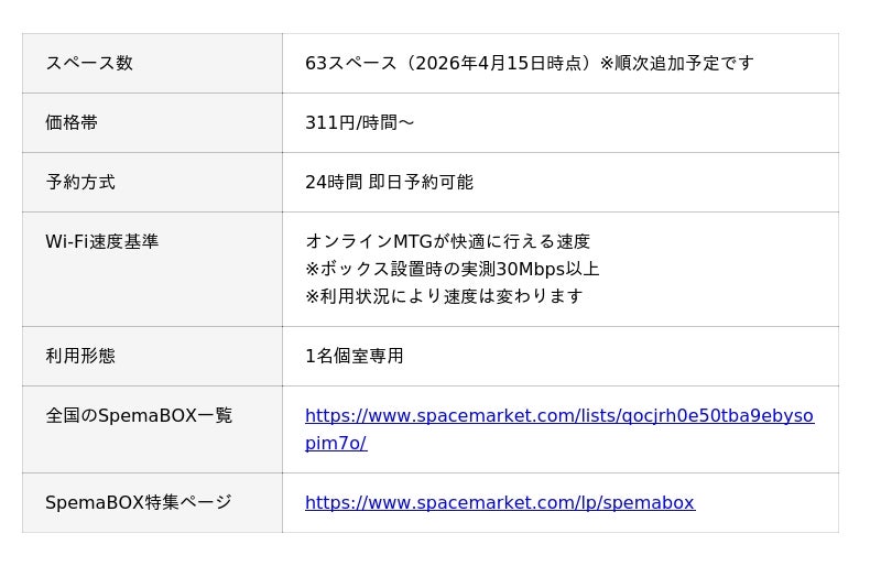 「SpemaBOX」は、スペースマーケット上のワークボックスを対象とした全国63か所に展開する新ブランドです。Web会議でも快適に利用できるWi-Fi速度を担保しており、全スペースが最寄り駅から平均徒歩2.5分以内、最大徒歩7分以内に位置しています。スマートフォンから24時間いつでも即時予約が可能です。