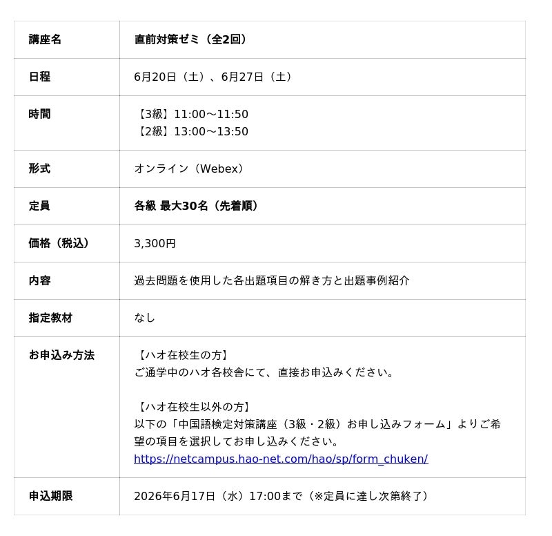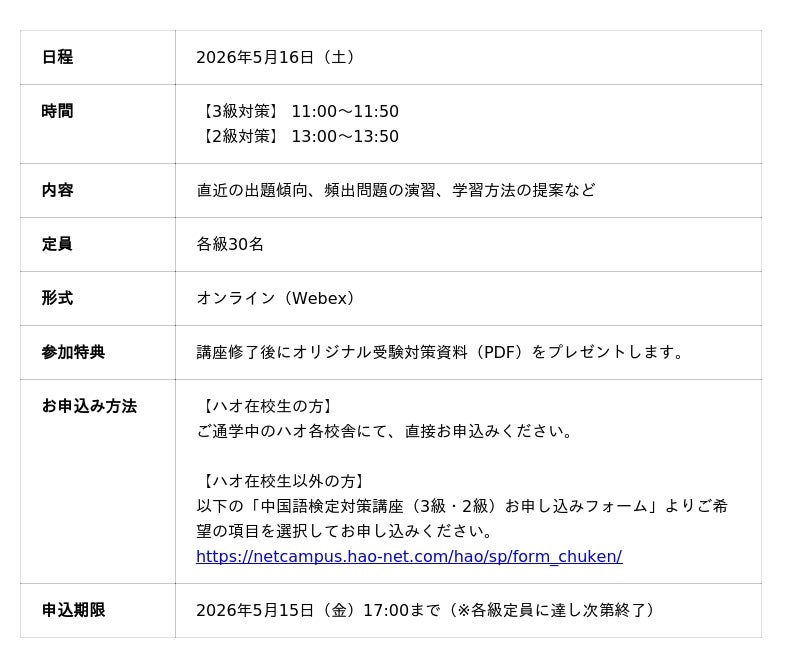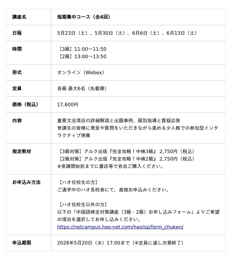 株式会社イーオン(本社:東京都新宿区、代表取締役社長:重野卓、以下「イーオン」)が運営するハオ中国語アカデミー(以下「ハオ」)は、2026年6月に実施される中国語検定(以下「中検」)の2級・3級対策として、5月から「短期集中コース(全4回)」を、6月に「直前対策ゼミ(全2回)」をオンラインで開講いたします。