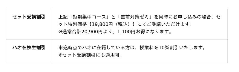 今回は「短期集中コース」と「直前対策ゼミ」の同時申し込みでお得になる「セット受講特別価格」をご用意しています。さらに、講座に興味はあるけれど受講できるか不安な方や、講座の雰囲気や流れを知りたいという方に向けて「短期集中コース」と「直前対策ゼミ」ではどのように学習していくのかを体験できる無料講座(参加特典つき)も5月16日(土)に開催いたします。