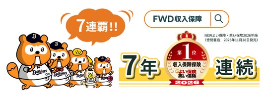 2025 年 11 月28日発売のNEW よい保険・悪い保険2026年版(徳間書店)において、『FWD収入保障』が2018年の発売から7年連続で、ベストランキング第1位を獲得しました。