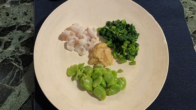水だこの吸盤とそら豆と春菊の酢味噌、