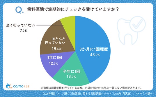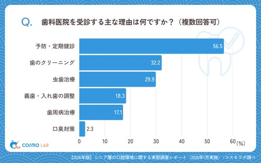 定期的に口腔環境をチェックする人は「3か月に1回程度」(43.2%)が最多で、「半年に1回」(18.0%)、「1年に1回」(12.2%)と続きました。受診する理由は「予防・定期健診」(56.5%)が中心で、予防志向が明らかになりました。