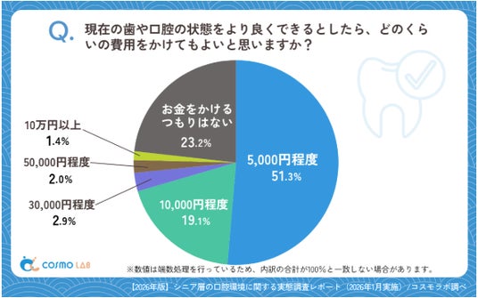 口腔状態をより良くできる場合の許容費用は「5,000円程度」(51.3%)が最多でした。一方で「10,000円程度」(19.1%)も一定割合で、「お金をかけるつもりはない」(23.2%)と回答した人もみられます。