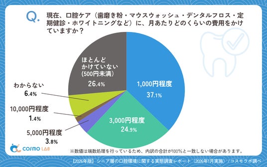 口腔ケアにかける費用は「1,000円程度」(37.1%)が最多で、「ほとんどかけていない(500円未満)」(26.4%)、「3,000円程度」(24.9%)が続きました。