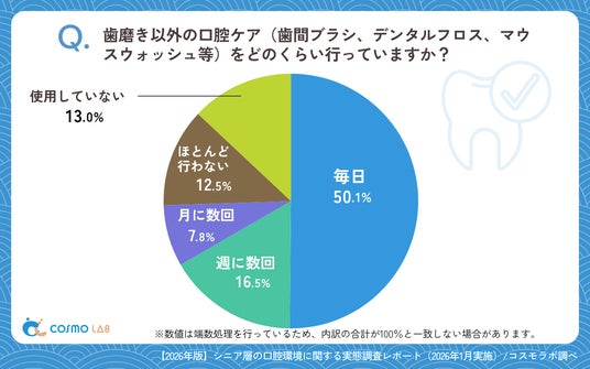 歯磨き以外の口腔ケアは「毎日」(50.1%)が最多となり、補助清掃の実施が広く浸透していることが明らかになりました。