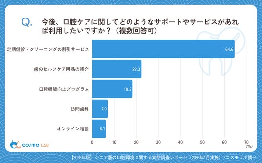 次いで「歯のセルフケア用品の紹介」(22.3%)、「口腔機能向上プログラム」(18.3%)が続き、情報提供と機能改善への関心も確認できます。「訪問歯科」(7.0%)や「オンライン相談」(6.1%)も挙がっており、通院負担を補う選択肢の整備が求められます。