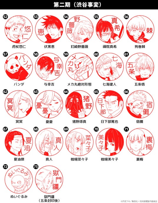 アニメ第3期「死滅回游」より、虎杖悠仁、伏黒恵、乙骨憂太、禪院真希、パンダ、秤金次、禪院直哉たち16キャラクターがあらたに登場。全104種類から選べるラインナップに