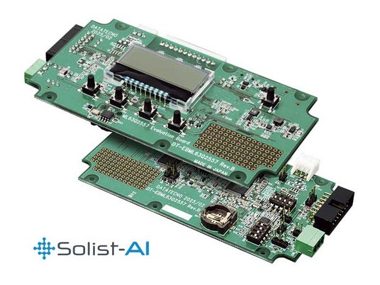 ロームのSolist-AI(TM)マイコンを搭載した、データ・テクノ社製マイコンボードです。初期評価用に加速度センサボードと40cmケーブル、樹脂筐体を同梱しています。