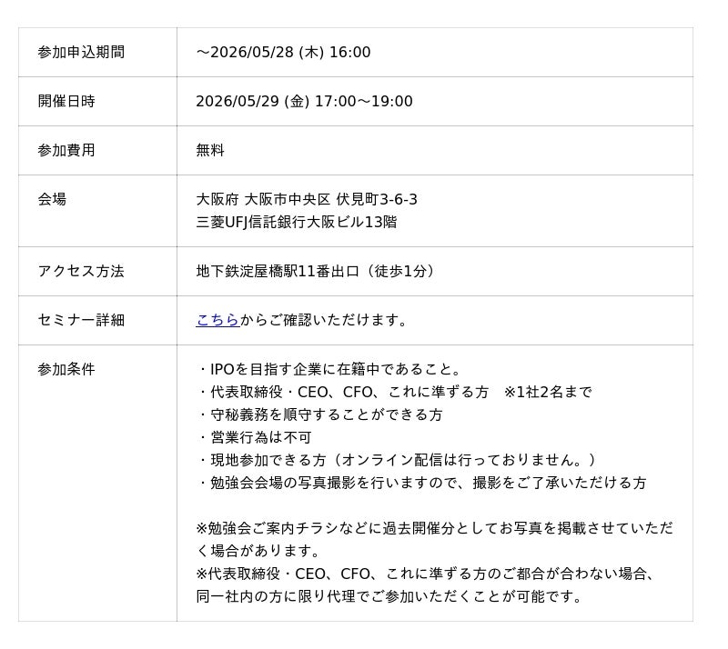 公認会計士人材の知見・経験を活用した経営支援サービスを展開するブリッジコンサルティンググループ株式会社(所在地:東京都港区、代表者:宮崎良一)は、2026年5月29日(金)、大阪にて「第44回 IPO勉強会」を開催いたします。