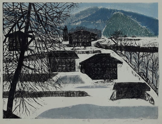 袖垣治彦氏来歴袖垣治彦氏は1929(昭和4)年、吉城郡上宝村(現高山市上宝町)で生まれ、1954(昭和29)年に岐阜大学美術工芸学科を卒業。教職に就いた後、戦後の飛騨地方における教育版画の指導者として活躍し、共同木版画の実践など地域に根づいた版画教育に力を注ぎました。制作活動にも精力的に取り組み、新制作協会展への出品や岐阜県展、日本版画協会展で入選を重ね、1972(昭和47)年以降は名古屋市で個展を開催。1977(昭和52)年に木版画集『飛騨の民具』を出版し、近年は鹿沼市立川上澄生美術館木版画大賞展や飛騨高山現代木版画ビエンナーレ展での受賞歴もあります。氏の作品は飛騨地方の自然や祭り、民俗文化を背景に持ち、地域の魅力を彫り続けてきました。