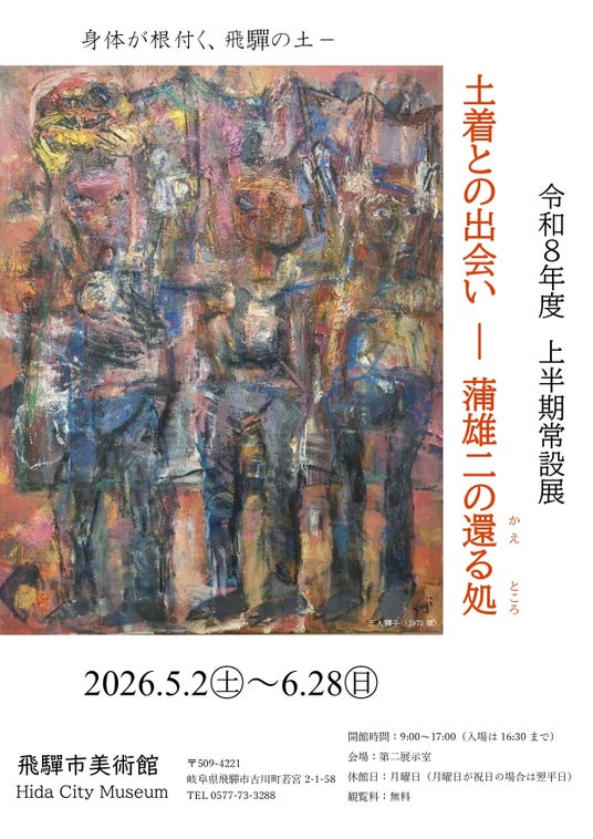 常設展では、飛騨市文化交流センターの緞帳(どんちょう)に採用されている《創造のドラムは響き》を手がけた蒲雄二氏の展覧会を開催します。成蹊大学在学中に美術部を設立し画家の道を志して以来、東京や飛騨地方で数多くの個展やグループ展を開催。モダンアート展での活躍や日伯現代美術展など各種公募展で多数の受賞歴を持ち、地域文化にも貢献しました。1972(昭和47)年メキシコへの初の海外渡航や2010年代の数度に渡るネイティブアメリカンとの交流を通じて、土着文化に深い関心を寄せ、自然観や世界観を深めたことが作品の重要なテーマとなっています。本展では「土着」をキーワードに、海外で得たインスピレーションによる抽象作品を中心に紹介します。