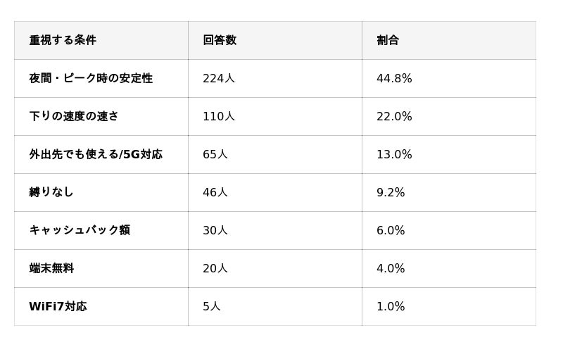 速いWiFiに乗り換えを検討する場合に最も重視したい条件を聞いたところ、「夜間・ピーク時の安定性」が44.8%で圧倒的1位でした。