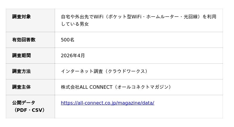 通信インフラ事業と地域振興事業を手掛ける株式会社ALL CONNECT(代表取締役社長:岩井宏太・本社:福井県福井市)が運営する通信メディア「オールコネクトマガジン(https://all-connect.co.jp/magazine/)」は、WiFi利用者500人を対象に、WiFiの通信速度に関する意識・満足度・後悔についての調査を行いました。