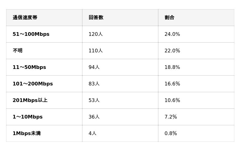 「公式最大速度より大幅に遅かった」(11.4%)も注目すべきデータです。公式サイトに記載される「最大速度」はあくまで理論値であり、実際の利用環境では大幅に下回ることがあります。