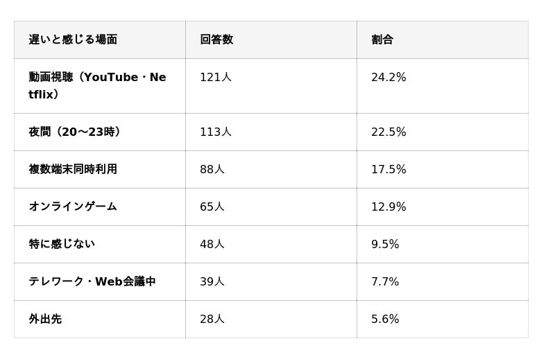 「動画視聴」と「夜間」はまさに重なる時間帯です。夜間は家族が同時にWiFiを使うピークタイムであり、動画視聴やオンラインゲームなど大容量通信が集中するため、速度低下を体感しやすいと考えられます。