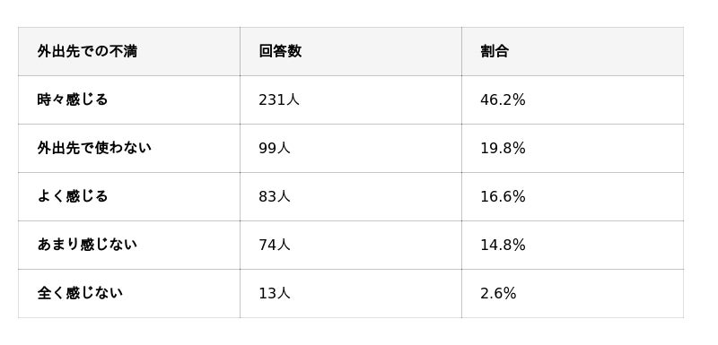「外出先で使わない」(19.8%)を除いた外出先WiFiユーザーに限ると、約78%が外出先で速度に不満を感じていることになります。自宅と比べて外出先ではさらに速度への不満が大きい実態が浮き彫りになっています。
