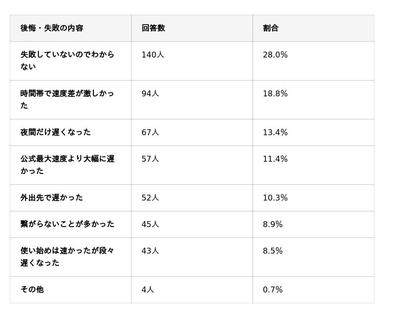 「時間帯で速度差が激しかった」と「夜間だけ遅くなった」を合わせると32.2%にのぼり、夜間・ピーク時の速度低下が最大の後悔要因です。