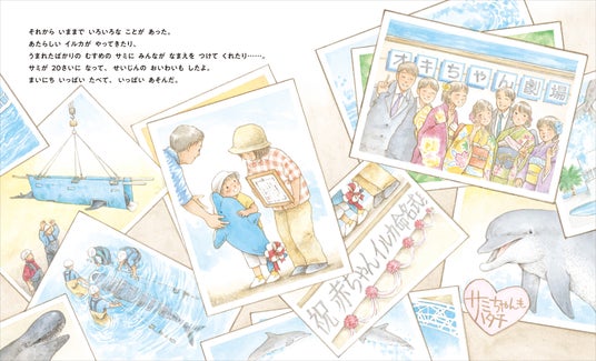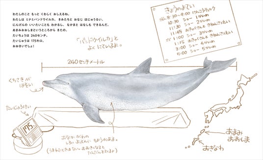 オキちゃんの好物や得意技にはじまり、仲間のイルカたちとのエピソード、愛娘サミへのあたたかな眼差し、水族館スタッフ、そして観客たちとの関わりを描いています。