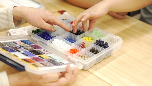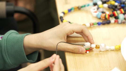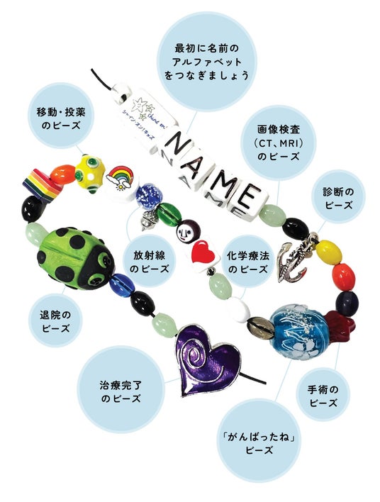 子どもたちは治療の過程を色とりどりのガラスビーズで記録していきます。輸血したときは赤いビーズ、髪が抜け始めたときは顔のビーズなど、処置や治療ごとに決められたビーズを、ビーズ大使である医療スタッフと対話しながら子どもが自らつなぎます。