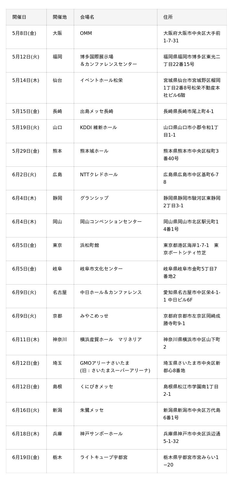 2026年は大阪・福岡・仙台・長崎・山口・熊本・広島・静岡・岡山・東京・岐阜・名古屋・京都・神奈川・埼玉・島根・新潟・兵庫・栃木の19会場で開催いたします。今回山口県では初開催となります。